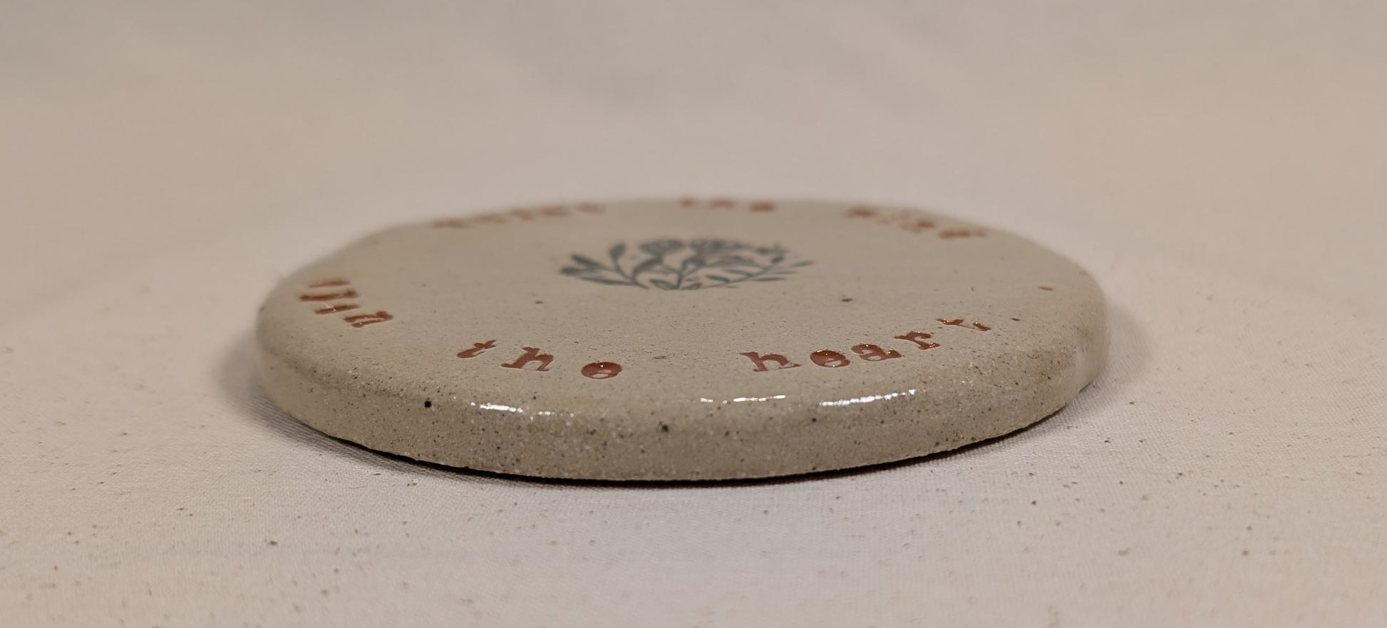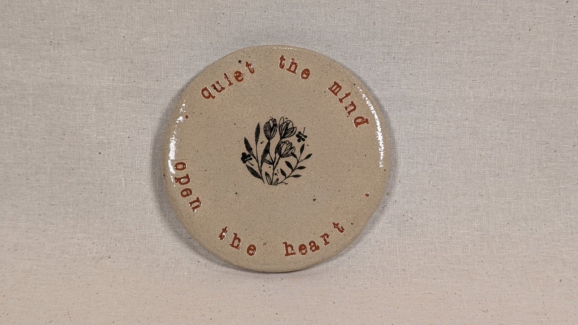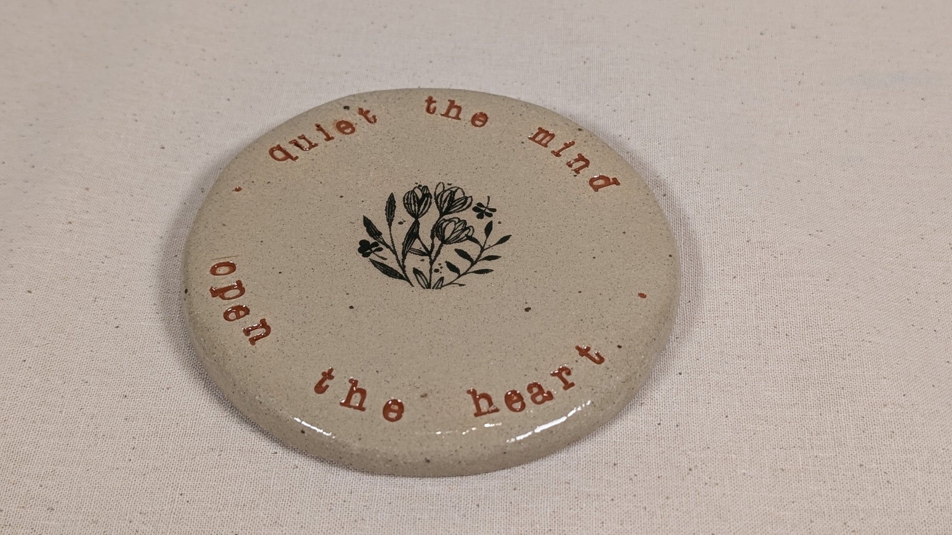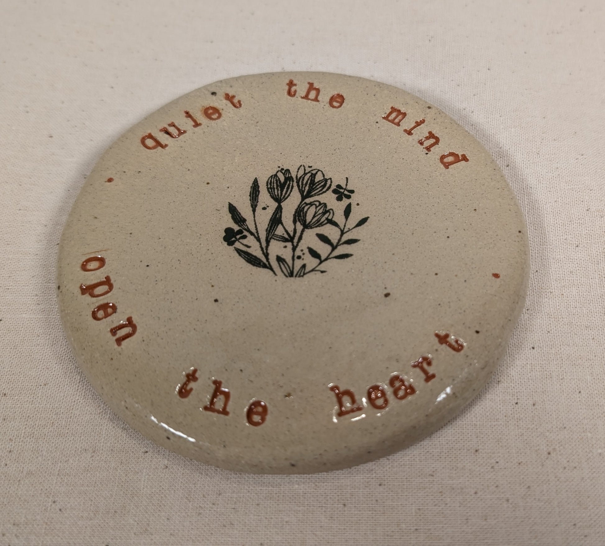 Each coaster has the following wording 'quiet the mind . open the heart' which is inspired by my love for the words spoken by Ram Dass, specifically the Jon Hopkins with Ram Dass East Forest - Sit Around the Fire video which can be found on YouTube.